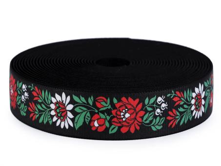 Elasisches Band mit Folk-Druck für die Herstellung von Hosenträger oder zum Abheben der Taille von Hosen, Röcke oder Kleider. Das Gummiband ist fest gespannt.