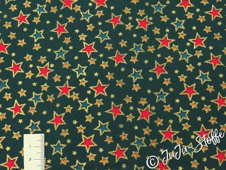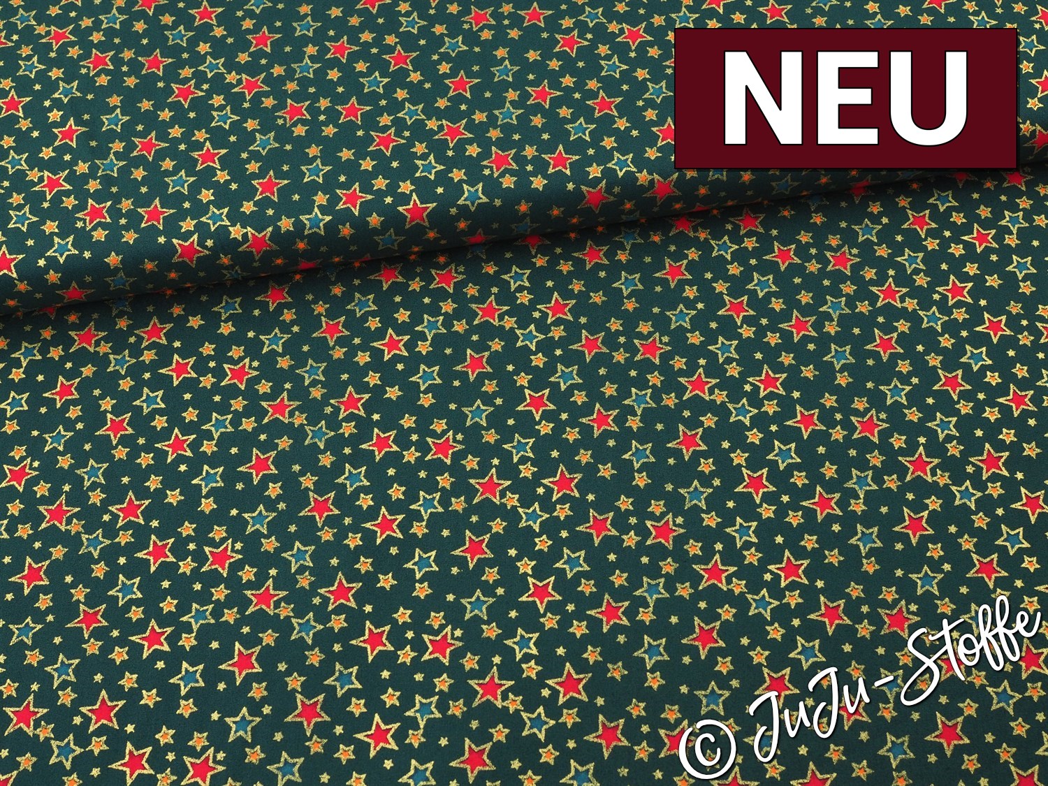 Dieser festliche Baumwollstoff zeigt ein wunderschönes Sternenmuster in Rot, Blau und Gold auf tiefgrünem Hintergrund. Die metallisch glänzenden Details verleihen dem Stoff eine edle Note und machen ihn perfekt für weihnachtliche Nähideen, Dekorationen und festliche Accessoires.