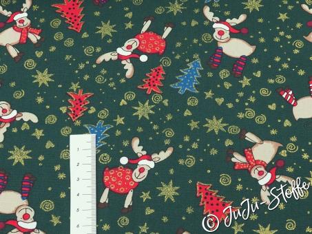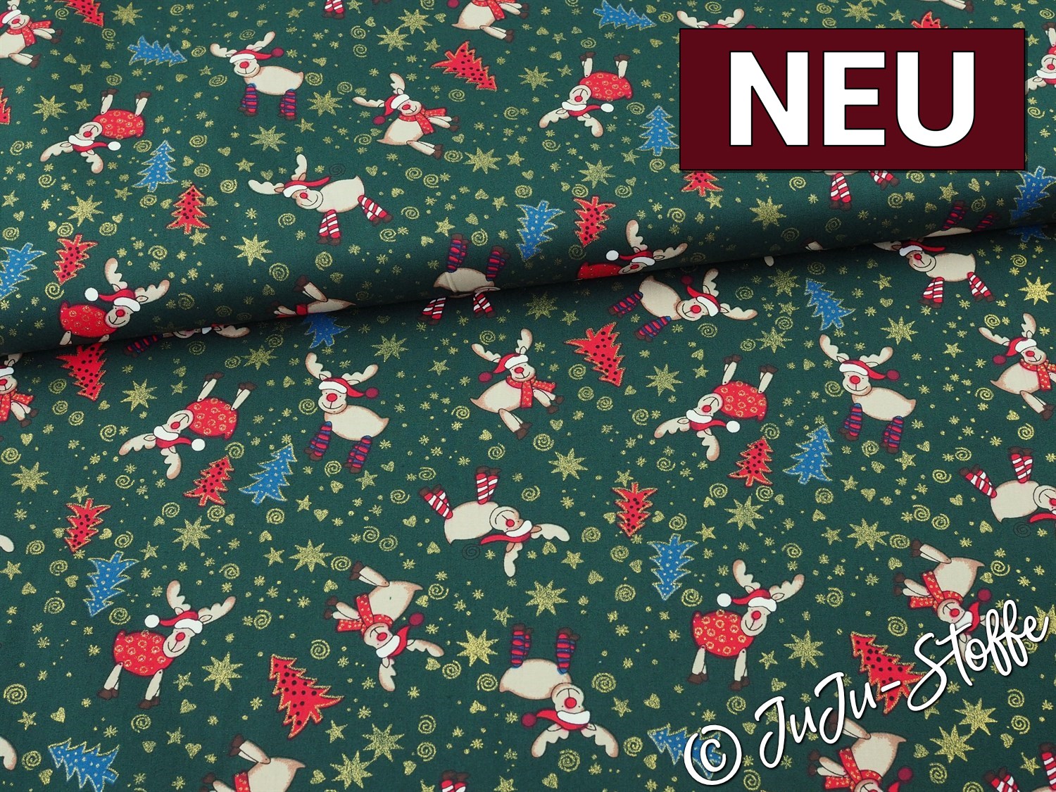 Dieser fröhliche Baumwollstoff zeigt ein liebevolles Weihnachtsmotiv mit lachenden Rentieren, festlichen Tannenbäumen und goldglänzenden Sternen auf grünem Hintergrund. Das verspielte Design sorgt für eine gemütliche Weihnachtsstimmung und ist ideal für kreative Nähideen in der Adventszeit.