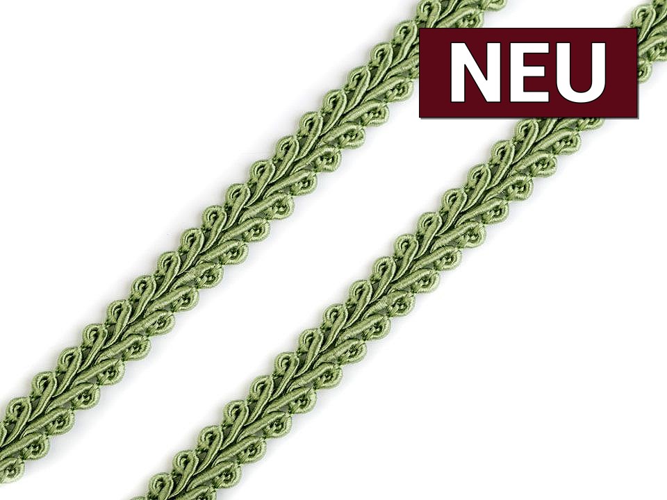 Diese feine Borte in zartem Grün überzeugt mit ihrem verspielten, ornamental wirkenden Muster und einer dezenten, eleganten Struktur. Der sanfte Grünton verleiht Nähprojekten eine natürliche und frische Note – perfekt für Dekorationen, Bekleidung und Accessoires mit Stil.