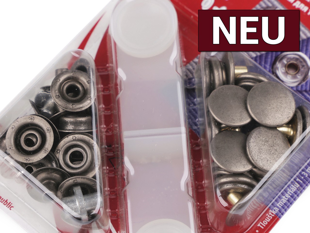 Ein Set enthält 10 Druckknöpfe mit passendem Werkzeug.
