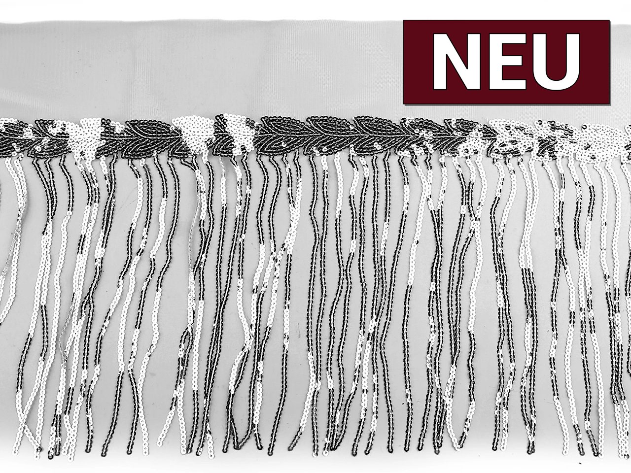 Die Borte am Monofilament ist mit einer Paillettenborte mit Blättern und Fransen mit Pailletten verziert, dank der sie elegant und luxuriös aussieht. Mit der Borte können Sie Tanzkleider sowie Party- und Ballkleider verzieren, wo ihr Glanz und Glitzer bei Bewegungen perfekt zur Geltung kommen.