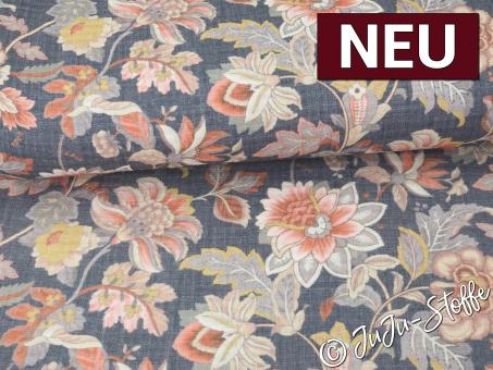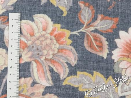 Dieser weiche Musselinstoff zeigt ein harmonisches Fantasieblumen-Design in warmen Rosé-, Creme- und Gelbtönen auf dunkelblauem Hintergrund. Die feine, leicht gecrinkelte Struktur unterstützt den natürlichen Look und verleiht dem Stoff eine lebendige, angenehm textile Tiefe.