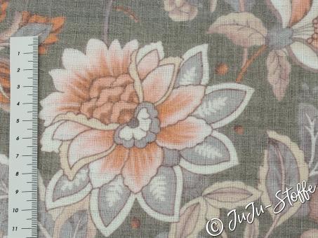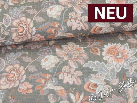 Dieser weiche Musselinstoff präsentiert ein fantasievolles Blumenmotiv in warmen Rosé-, Creme- und Grautönen auf einem gedeckten Grünton. Die leicht gecrinkelte Oberfläche unterstützt den natürlichen Charakter des Stoffes und lässt die farbigen Blüten besonders harmonisch wirken.