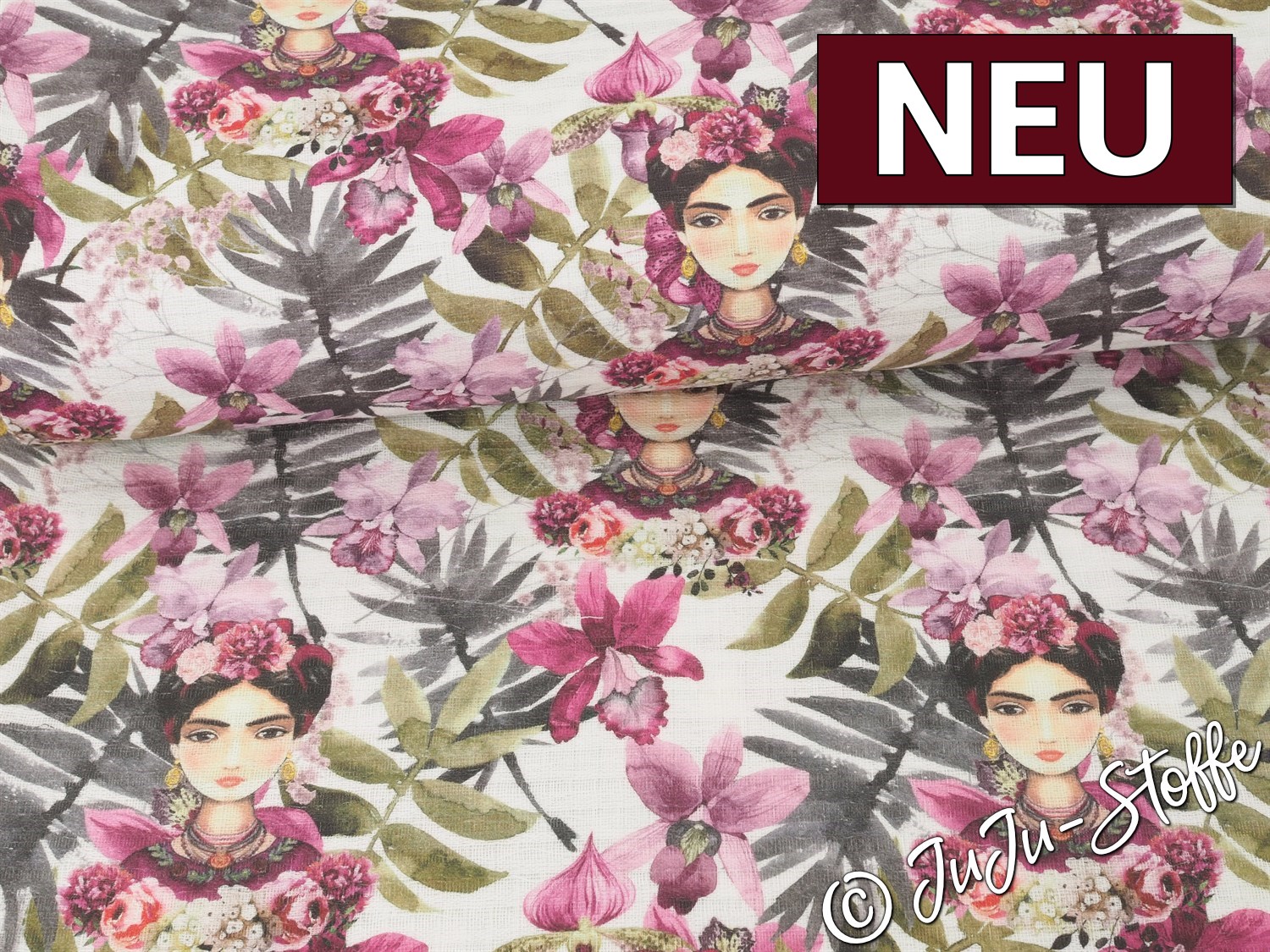 Dieser weich fallende Musselinstoff zeigt ein ausdrucksstarkes, künstlerisches Portrait von Frida Kahlo, umgeben von üppigen floralen Elementen in warmen Rosé-, Pink- und Grüntönen. Die lebendige Farbkombination verleiht dem Stoff eine besondere Tiefe und macht ihn ideal für einzigartige Kleidungsstücke oder Accessoires.