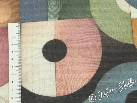 Dieser moderne Musselinstoff zeigt ein stilvolles Muster aus geometrischen Formen in harmonisch abgestimmten Farben. Halbkreise, Kreise und Segmentflächen in warmen und kühlen Tönen erzeugen einen ausgewogenen, zeitgemäßen Look. Die leicht gecrinkelte Oberfläche verstärkt den natürlichen Charakter des Stoffes und verleiht dem Design eine angenehm textile Tiefe.