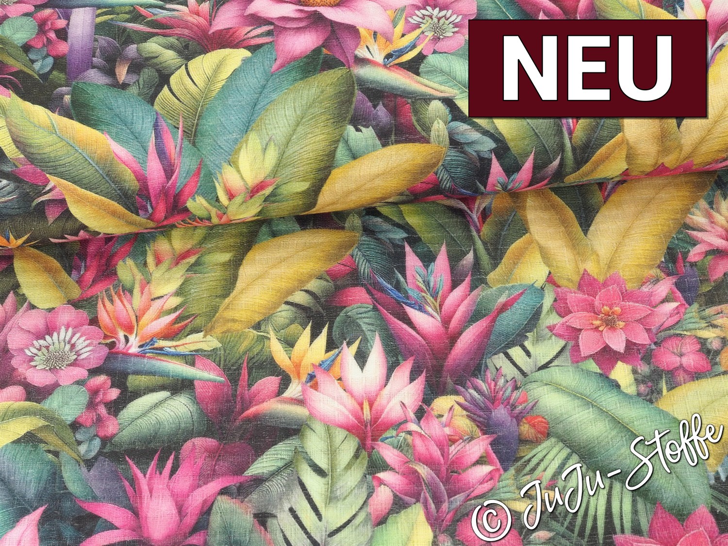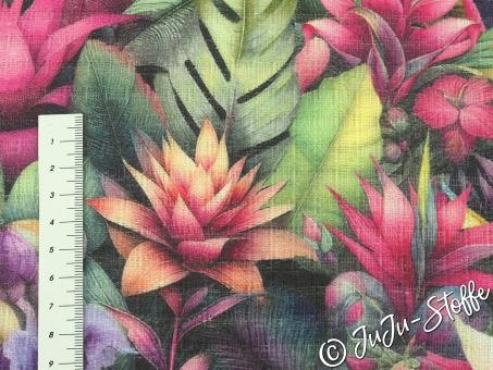 Dieser farbintensive Musselinstoff zeigt ein prachtvolles Paradiesgarten-Design mit üppigen Blüten in Pink-, Rot-, Orange- und Violettnuancen, eingerahmt von dekorativen Blättern in satten Grüntönen. Die leicht gecrinkelte Oberfläche verleiht dem Stoff eine lebendige Tiefe und betont den exotisch-tropischen Charakter des Motivs.