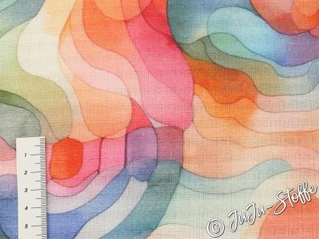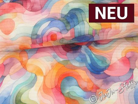 Dieser farbenfrohe Musselinstoff zeigt ein sanft fließendes Wellenmotiv in harmonisch ineinander übergehenden Farbnuancen. Die weichen Kurven in Rosa-, Blau-, Grün-, Orange- und Gelbtönen erzeugen eine lebendige, fast aquarellartige Optik. Die leicht gecrinkelte Oberfläche unterstreicht den natürlichen Charakter des Stoffes und verleiht dem Design eine angenehm textile Tiefe.