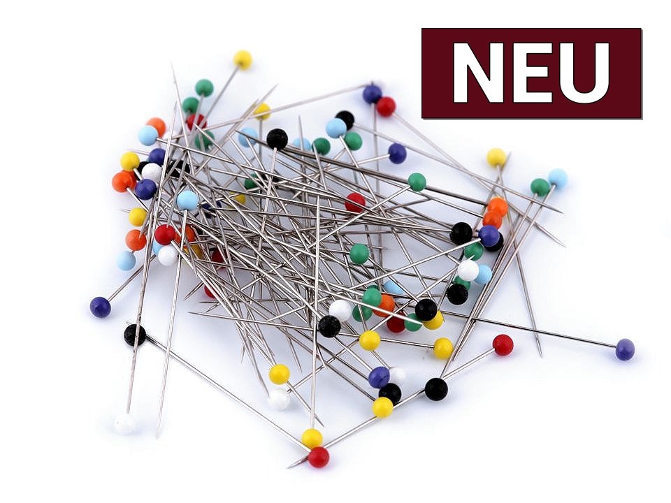 Hochwertige Stecknadeln mit Glaskopf. Geliefert werden die ca. 80 Nadeln in einer praktischen Aufbewahrungsschachtel aus transparenten Kunststoff.