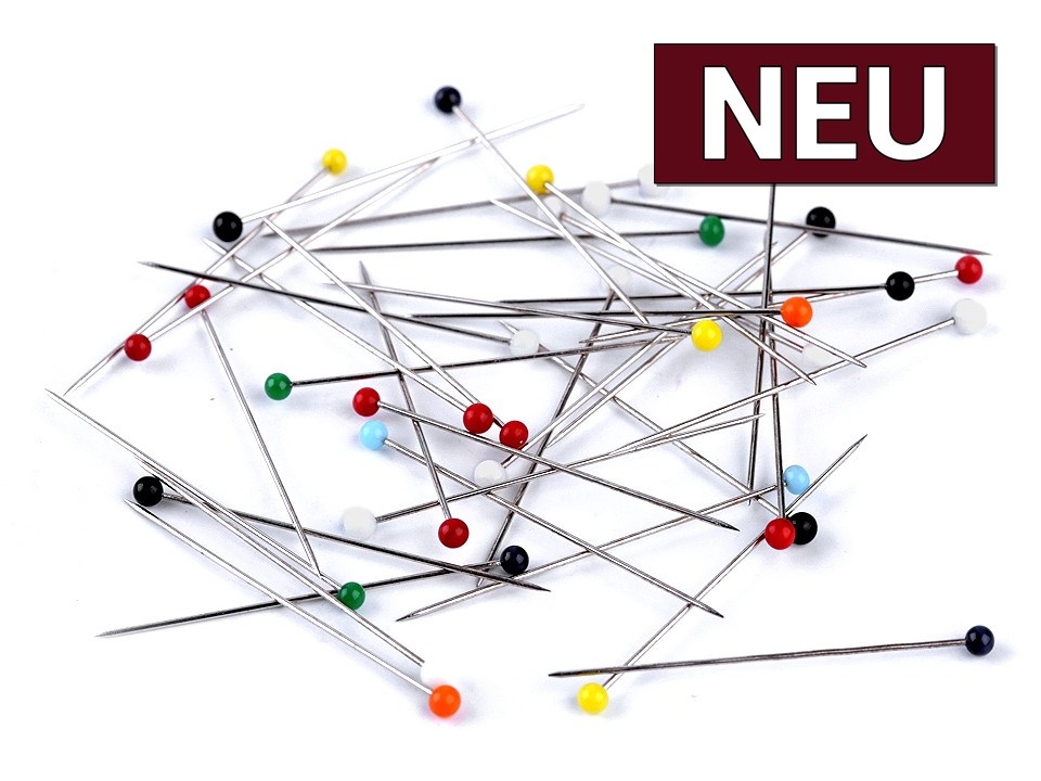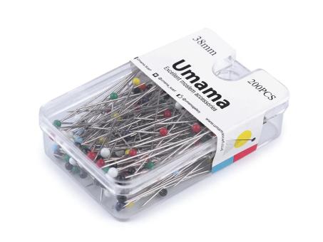 Hochwertige Stecknadeln mit Glaskopf. Geliefert werden die ca. 200 Nadeln in einer praktischen Aufbewahrungsschachtel aus transparenten Kunststoff.