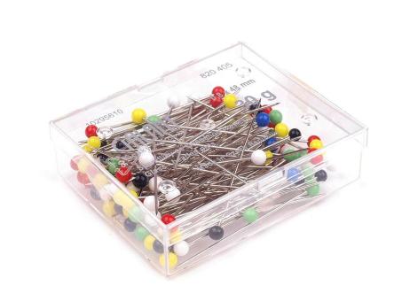 Hochwertige Stecknadeln mit Glaskopf. Geliefert werden die ca. 100 Nadeln in einer praktischen Aufbewahrungsschachtel aus transparenten Kunststoff.