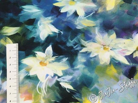 Dieser wunderschöne Viskosestoff zeigt ein künstlerisches Aquarellblumen-Motiv in sanften Blau-, Grün- und Gelbtönen. Die weich verlaufenden Farben und die detailreich gemalten Blüten verleihen dem Stoff eine elegante, lebendige Ausstrahlung. Ideal für sommerliche Kleidung, die Leichtigkeit und Stil vereint.