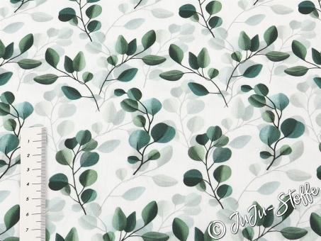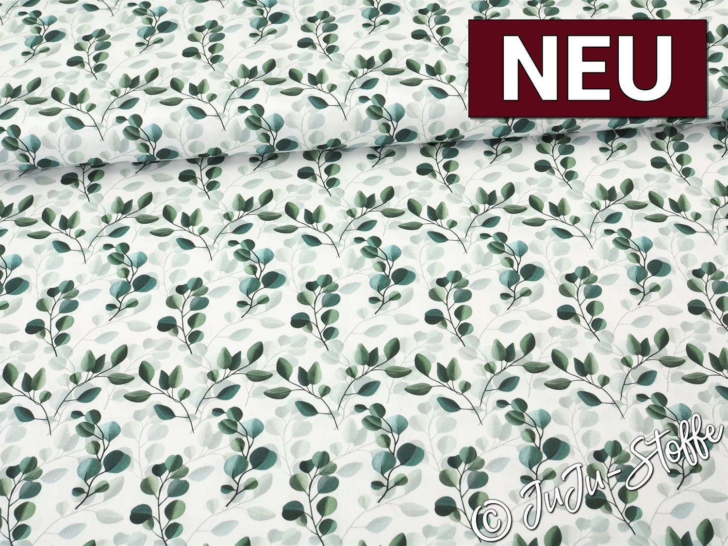Bringe eine frische, natürliche Brise in Deine Nähstube mit dieser wunderschönen Baumwoll-Webware. Das Design besticht durch filigrane Eukalyptuszweige in verschiedenen Grün- und Salbeitönen, die sich sanft über den strahlend weißen Hintergrund verteilen. Die Kombination aus detailreich gezeichneten Blättern und zarten, schattenartigen Silhouetten im Hintergrund verleiht dem Muster eine beeindruckende Tiefe und eine beruhigende, moderne Ästhetik – ideal für zeitlose Kreationen im Botanical-Stil.
