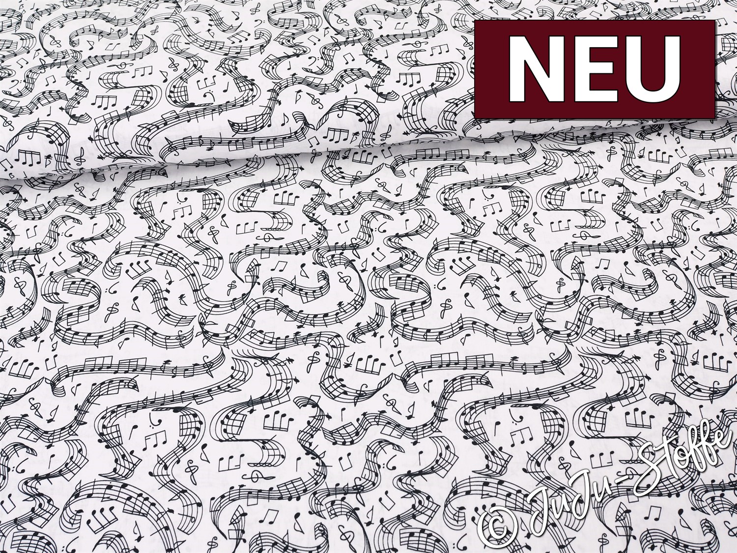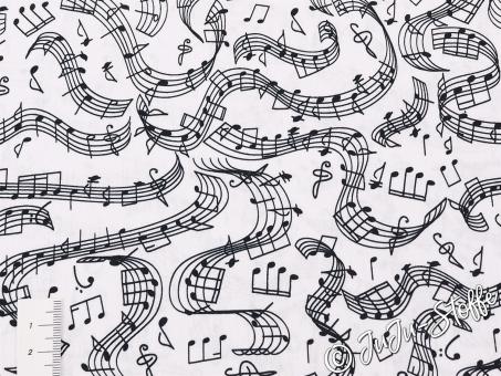 Lasse Deine Nähprojekte im richtigen Rhythmus erklingen! Diese elegante Baumwoll-Webware begeistert durch ein dynamisches Muster aus geschwungenen Notenlinien, Notenschlüsseln und Notenwerten. Das klassische Design in zeitlosem Schwarz auf strahlend weißem Hintergrund wirkt wie eine lebendige Komposition auf Stoff. Ob für Musikliebhaber, Chor-Mitglieder oder Instrumentalschüler – dieses Motiv bringt eine harmonische und künstlerische Note in jede kreative Arbeit.