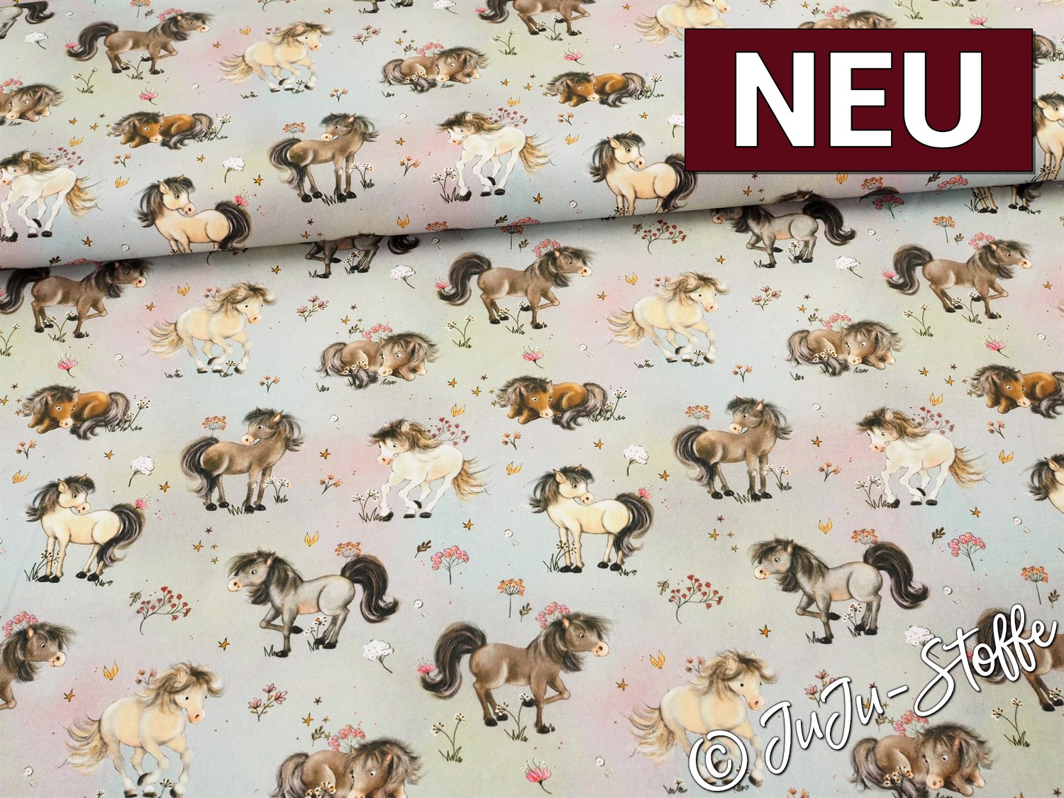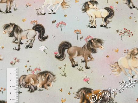 Lasse Kinderträume wahr werden mit dieser zauberhaften Baumwoll-Webware. Das Design "Traumpferde" entführt Dich in eine sanfte Welt voller kleiner Ponys, die inmitten zarter Blumenwiesen grasen und spielen. Die liebevoll illustrierten Motive auf einem dezenten, pastellfarbenen Hintergrund in Beige- und Rosatönen verleihen dem Stoff eine besonders ruhige und harmonische Ausstrahlung. Ein absolutes Highlight für kleine Pferdefreunde, die ihre Lieblingstiere immer bei sich tragen möchten.