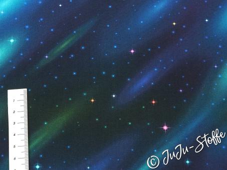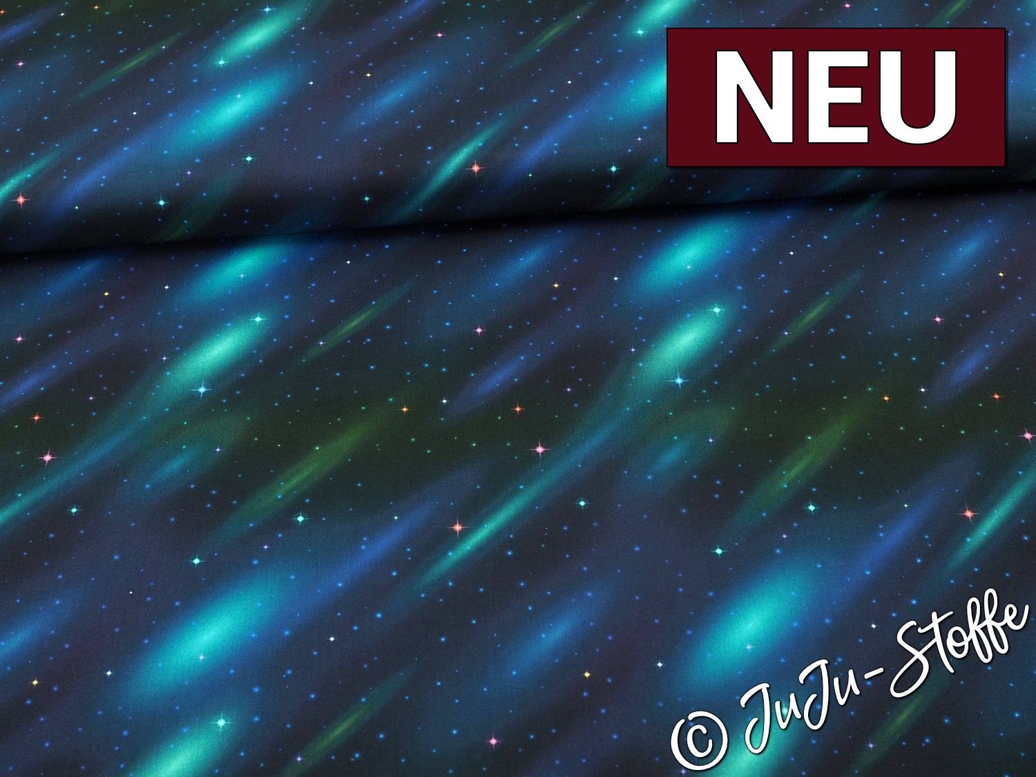 Lasse Dich von der magischen Schönheit ferner Galaxien verzaubern. Diese hochwertige Baumwoll-Webware fängt die faszinierende Atmosphäre des Weltalls perfekt ein: Auf einem tiefdunklen Untergrund erstrahlen leuchtende Nebelschwaden in Türkis, Blau und Smaragdgrün, die an tanzende Polarlichter erinnern. Kleine, farbenfroh funkelnde Sterne setzen zusätzliche Akzente und verleihen dem Design eine beeindruckende Tiefe. Ein traumhafter Stoff für alle Sternengucker und Träumer, die sich ein Stück Unendlichkeit nach Hause holen möchten.