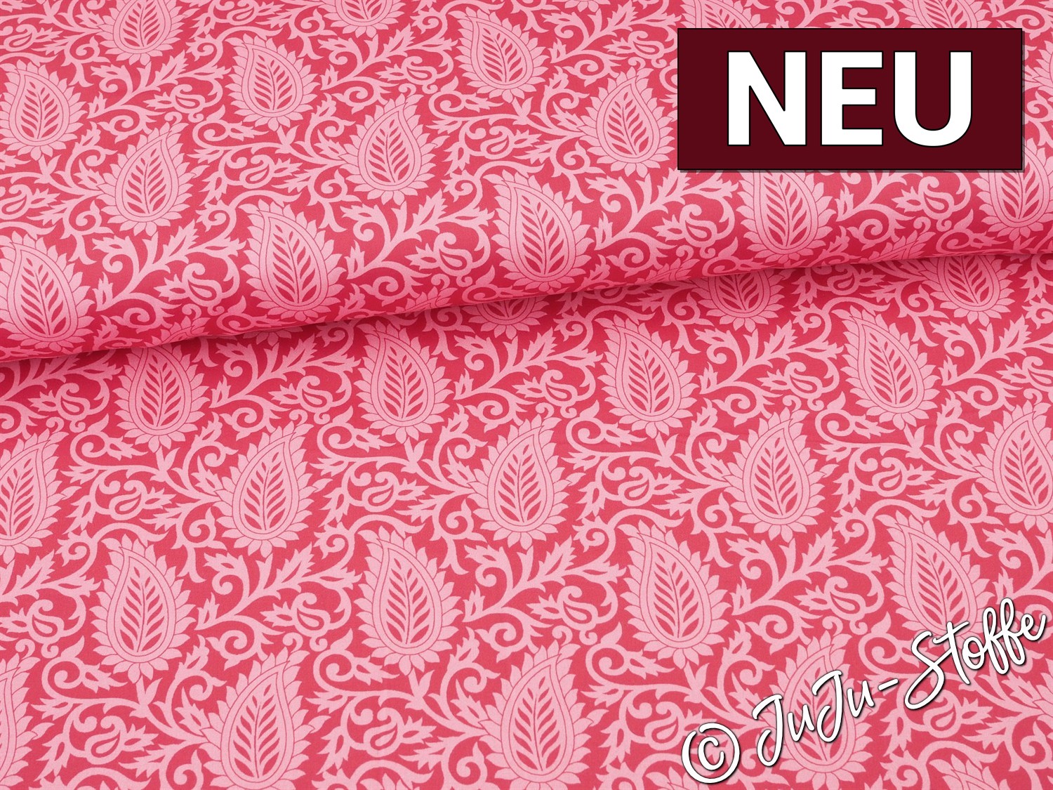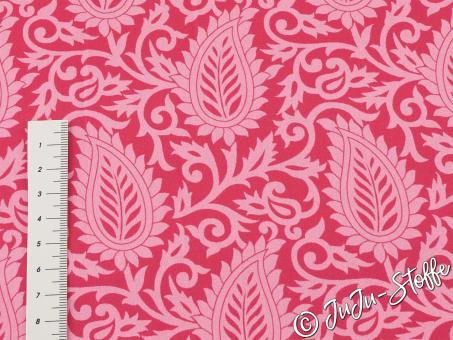 Dieser elegante Baumwollsatin präsentiert ein dekoratives Blätterdesign in kräftigem Pink und zarten Rosatönen. Die geschwungenen Blatt- und Rankenformen erzeugen ein harmonisches, leicht verspieltes Muster, das durch den feinen Glanz des Satins besonders edel wirkt.
