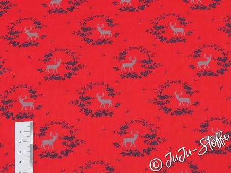 Dieser Baumwollsatin in kräftigem Rot zeigt ein klassisches Hirschmotiv, das von feinen Kränzen umrahmt wird. Das gleichmäßig wiederkehrende Muster wirkt traditionell und zugleich dekorativ und eignet sich hervorragend für zeitlose Nähprojekte mit besonderem Charakter.