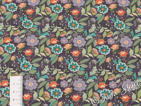 Diese farbenfrohe Popeline mit violettem Grund zeigt eine detailreiche Blumenwiese aus harmonisch abgestimmten Blüten und Blättern. In Türkis-, Orange-, Rosé- und Lilatönen heben sich die floralen Motive lebendig vom Hintergrund ab und verleihen dem Stoff eine frische, verspielte und zugleich elegante Ausstrahlung – ideal für kreative und ausdrucksstarke Projekte.