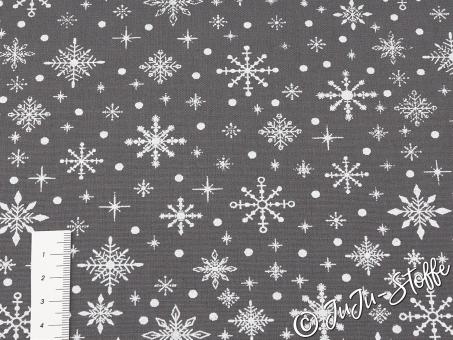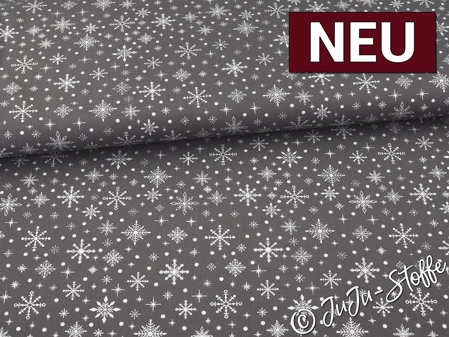 Dieser festliche Baumwollstoff in elegantem Grau ist mit filigranen, weißen Eiskristallen in verschiedenen Formen und Größen verziert. Die Motive sind mit einem feinen Metallic-Effekt versehen, der im Licht dezent schimmert und dem Stoff eine winterlich-edle Note verleiht. Ideal für Dekoration, Geschenkverpackungen, winterliche Accessoires oder stimmungsvolle Nähprojekte zur Advents- und Weihnachtszeit.
