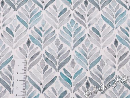 Dieser stilvolle Canvasstoff präsentiert ein modernes Blättermuster in harmonischen Blau-, Türkis- und Grautönen. Die Aquarelloptik und die gleichmäßige Anordnung der Blätter verleihen dem Stoff eine ruhige, frische Ausstrahlung – perfekt für skandinavische Wohnstile, maritime Deko oder elegante DIY-Projekte.