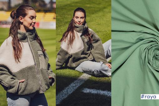 In einem dezenten Dusty Green gehalten, wirkt dieser Jackenstoff modern und zurückhaltend zugleich. Die matte, glatte Oberfläche unterstreicht den funktionalen Charakter des Stoffes und verleiht ihm eine elegante, unaufdringliche Optik – ideal für zeitlose Outdoor-Mode oder schlichte Accessoires mit Stil.