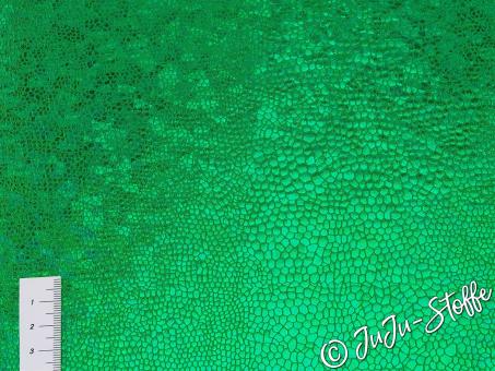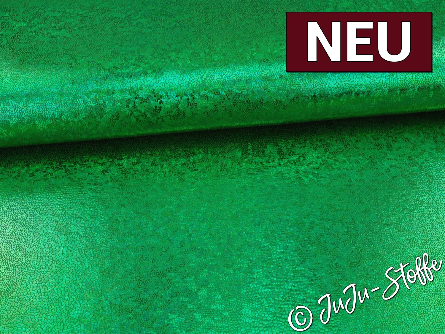 Setze ein leuchtendes Statement mit diesem extravaganten Folienjersey in kräftigem Grün. Die schillernde Metallic-Oberfläche kombiniert mit einer detailreichen Prägung in Schlangenoptik sorgt für eine faszinierende Tiefe und ein aufregendes Lichtspiel. Dieser Stoff ist genau das Richtige für Dich, wenn Du nach einem Material suchst, das garantiert alle Blicke auf sich zieht – ob für schillernde Kostüme, mutige Fashion-Highlights oder ausgefallene Accessoires.
