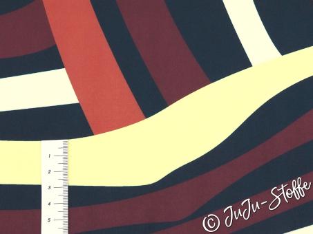 Dieser sportlich-moderne Funktions-Jersey begeistert mit einem dynamischen Streifenmuster in warmen Herbsttönen. Fließende Linien in Bordeaux, Rostrot, Creme und Dunkelblau verleihen dem Stoff eine bewegte Optik und machen ihn zu einem echten Hingucker – ideal für sportive Mode oder stylische Athleisure-Looks mit Charakter.