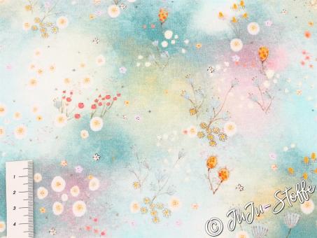Lass dich in einen verträumten Sommergarten entführen! Dieser Jersey besticht durch einen zauberhaften Blumenmix in zarten Pastelltönen. Auf einem Hintergrund, der wie eine sanfte Aquarell-Landschaft in Mint, hellem Gelb und zartem Rosa gestaltet ist, tummeln sich filigrane Gänseblümchen und feine Wildblumen. Die weichen Farbübergänge und die detailreichen floralen Elemente verleihen dem Stoff eine romantische und zugleich frische Ausstrahlung – perfekt für alle, die verspielte und feminine Designs lieben.
