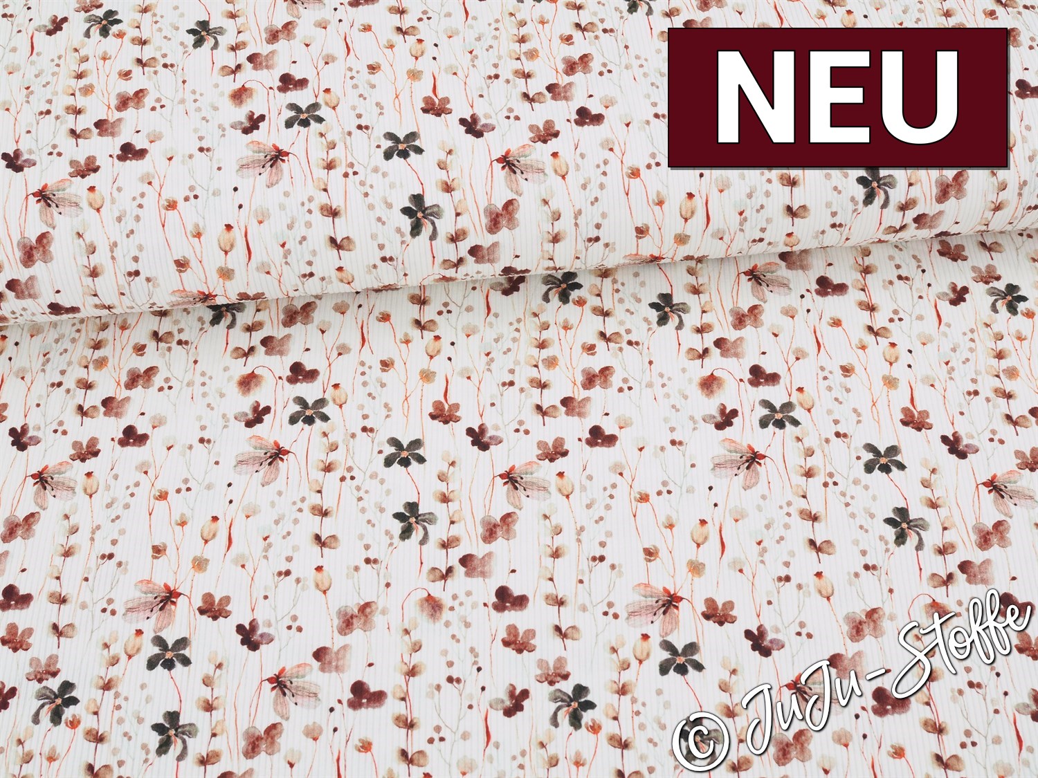 Dieser zart gestaltete Ripp-Jersey begeistert mit einem verspielten Muster aus feinen Blütenranken in warmen Bordeaux-, Rosé- und Brauntönen. Auf hellem Untergrund wirken die floralen Aquarellmotive besonders leicht und romantisch. Die dezente Rippenstruktur verleiht dem Stoff zusätzlich Tiefe und eine moderne Optik – ideal für feminine Kleidungsstücke mit liebevollen Details.