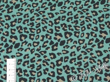 Setze modische Akzente mit diesem ausdrucksstarken Ripp-Jersey im Leoparden-Look. Der kühle Smaragdton (ein frisches Mint-Smaragd) dient als moderne Basis für das klassische Animal-Muster in Schwarz und Beige. Durch die charakteristische Rippenstruktur erhält das Design eine spannende Haptik und eine zusätzliche optische Tiefe. Ein absoluter Trendstoff für alle, die klassische Muster gerne mit frischen, mutigen Farben kombinieren.