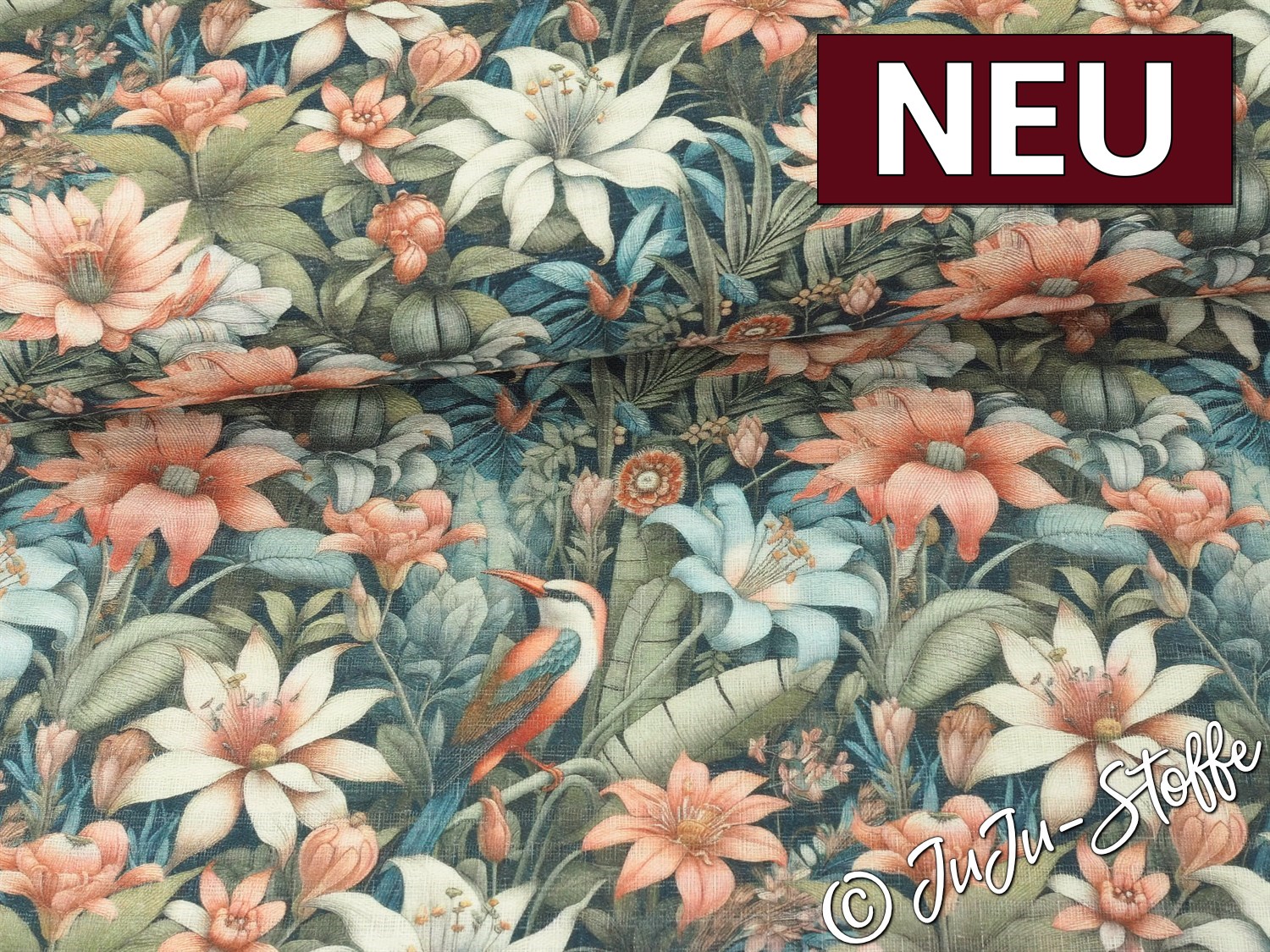Dieser detailreiche Musselinstoff zeigt ein zauberhaftes Dschungel-Paradies-Motiv mit exotischen Blüten und einem farbenprächtigen Vogel, eingebettet in üppiges Blattwerk. Die feine, leicht gecrinkelte Struktur verstärkt den natürlichen Charakter des Designs und verleiht dem Stoff eine lebendige, harmonische Tiefe.