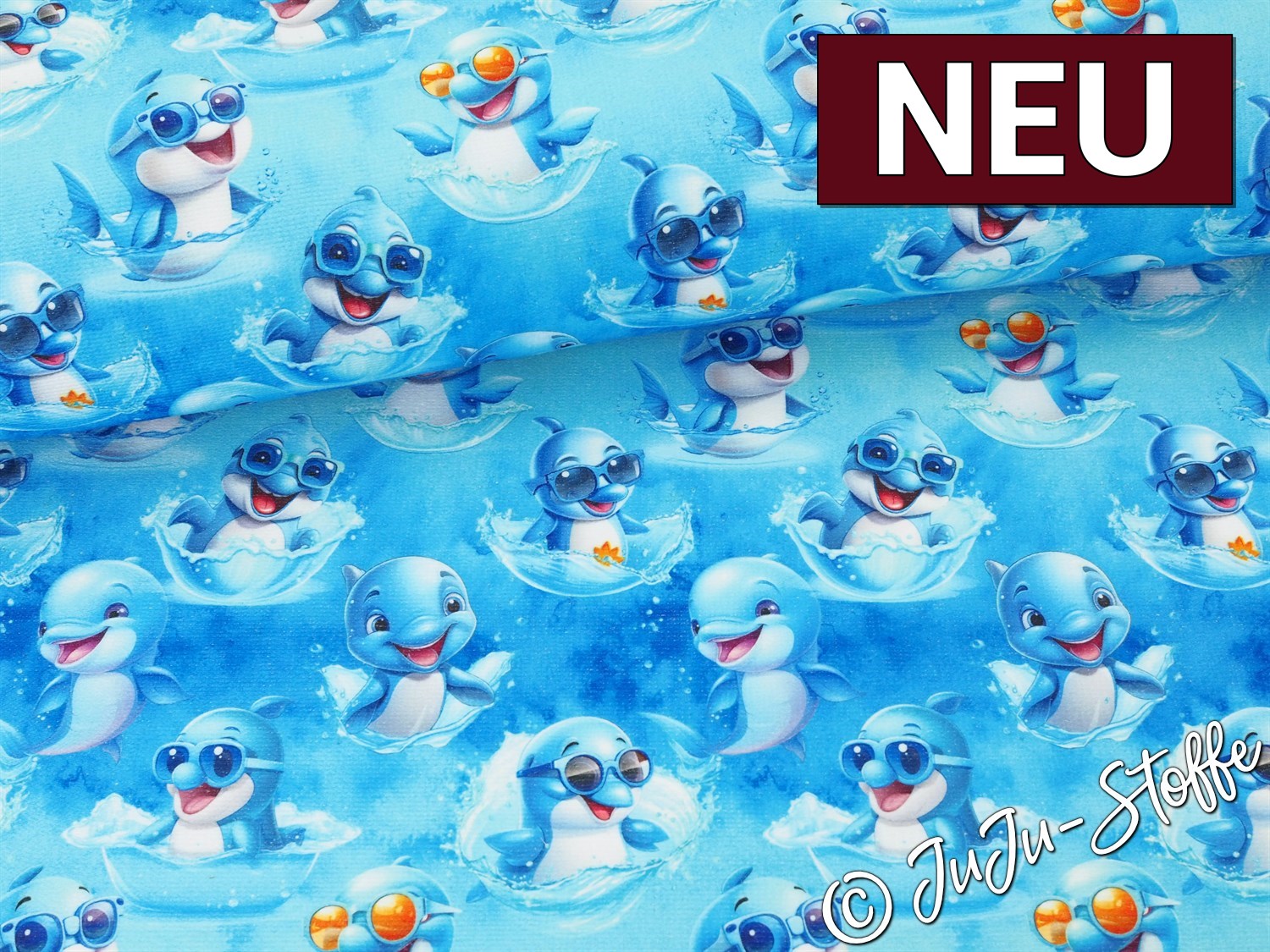 Der Frotteestoff „Delphin“ bringt maritimen Charme ins Nähprojekt. Fröhliche, blaue Delphine mit breitem Lächeln und teils stylischen Sonnenbrillen tummeln sich in spritzigen Wellen auf leuchtend blauem Hintergrund. Das lebendige Design eignet sich perfekt für Kinderbekleidung, Strandaccessoires oder verspielte Heimtextilien.