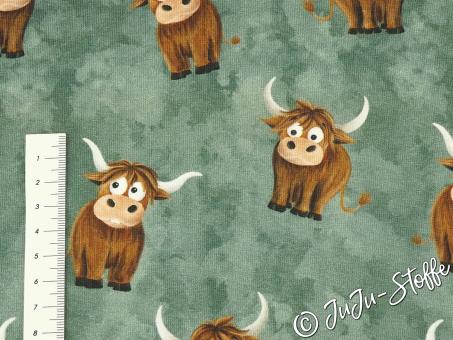Mit seinem liebevoll gezeichneten Kuh-Motiv auf grünem Hintergrund bringt dieser French Terry jede Menge Charme in Kinderzimmer und Kleiderschrank. Die niedlichen, leicht schusseligen Hochlandrinder mit großen Augen sorgen für gute Laune und machen den Stoff zur perfekten Wahl für verspielte Nähprojekte – nicht nur für Kinder.