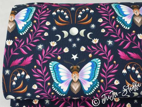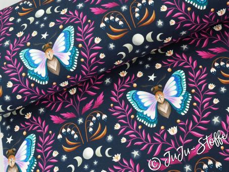 French Terry Midnight Luna Moth von der Designerin Susanne Firmenich von Hamburger Liebe mit wunderschönem Muster und Bordürenkante.