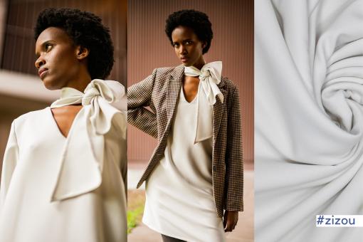Mit seiner komfortablen Breite und dem etwas höheren Gewicht eignet sich dieser Viskose-Crepe-Stoff hervorragend für Kleider, Blusen, Röcke oder elegante Hosen. Der Stoff fällt fließend, bleibt dabei formstabil und bietet durch den Elasthan-Anteil zusätzlichen Tragekomfort. Der Stoff ist ein Vorschlag aus dem Schnittmusterheft Fibre Mood Ausgabe 36.