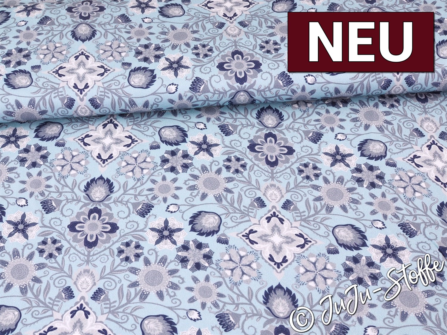 Entdecke die zeitlose Eleganz von „Tropical Flowers“ aus dem Hause Bienvenido Colorido. Dieser Stoff besticht durch ein filigranes, ornamentales Muster in harmonischen Blau- und Graustufen auf einem hellblauen Untergrund. Das Design erinnert an klassische Kachelmuster und florale Mandalas, die durch ihre feinen Details eine beruhigende und zugleich edle Ausstrahlung besitzen. Ein perfekter Stoff für Projekte, die sowohl modern als auch stilvoll wirken sollen.