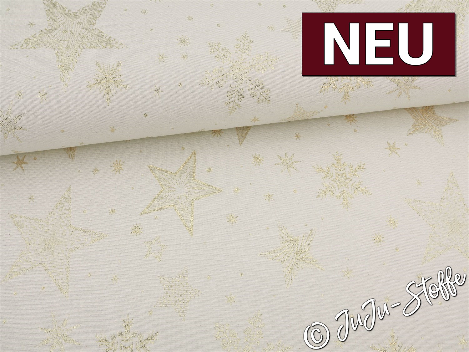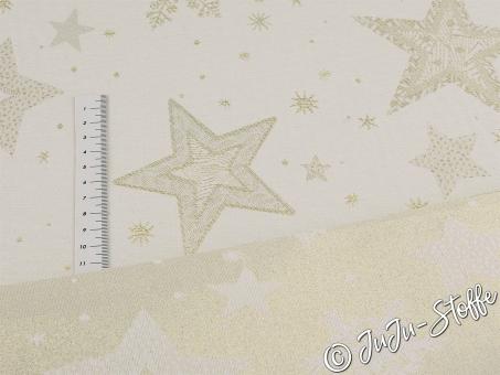 Dieser dekorative Jacquard-Dekostoff überzeugt mit einem klassischen Sternenmotiv in warmer goldener Metallic-Optik. Große und kleine Sterne verteilen sich harmonisch über den hellen Grundton und werden durch feine Lurexfäden elegant hervorgehoben. Die Doubleface-Webung sorgt dafür, dass auch die Rückseite optisch ansprechend gestaltet ist und vielseitig eingesetzt werden kann.