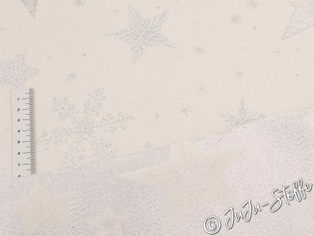 Dieser festliche Jacquard-Dekostoff begeistert mit einem stilvollen Sternenmotiv in edler silberner Metallic-Optik. Die unterschiedlich großen Sterne sind harmonisch verteilt und werden durch feine Lurexfäden akzentuiert, die dem Stoff einen dezenten, eleganten Glanz verleihen. Dank der Doubleface-Webung zeigt sich auch die Rückseite attraktiv und hochwertig.