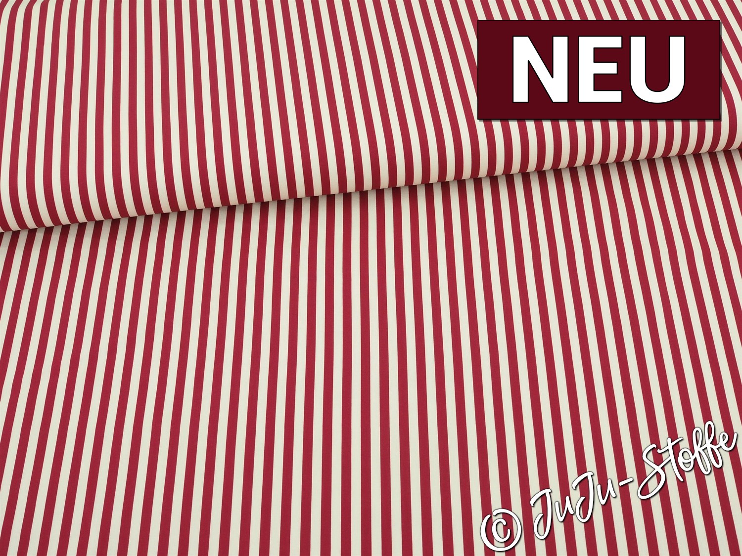 Diese Popeline aus reiner Baumwolle zeigt ein klassisches Streifenmuster in kräftigem Rot und klarem Weiß. Die gleichmäßigen, vertikalen Streifen verleihen dem Stoff eine frische, zeitlose Optik, die sich ideal für sommerliche Kleidung, Accessoires oder dekorative Nähprojekte eignet. Das klare Design wirkt modern und gleichzeitig angenehm schlicht.